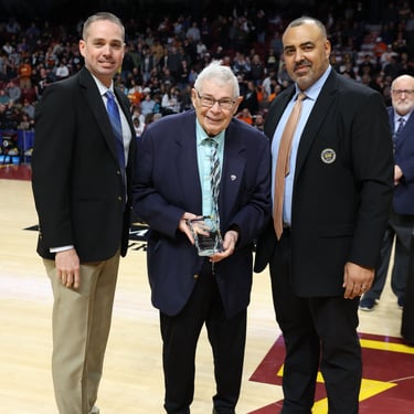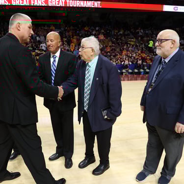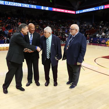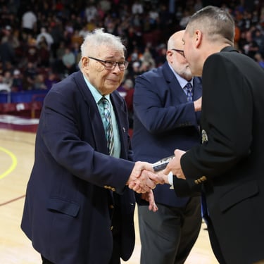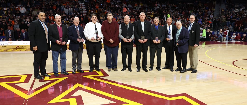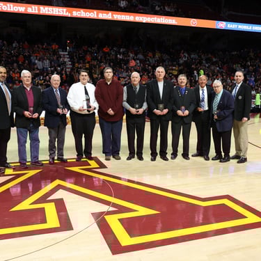 Chuck Clausen recieved his dedicated service award during the Boy's Basketball State Tournament. Chuck Clausen has been a 51-year registered official with the MSHSL. He's helped serve the league as an official, service member, clinician, assigner and regional coordinator. Seven others joined the Clawman on this day.
